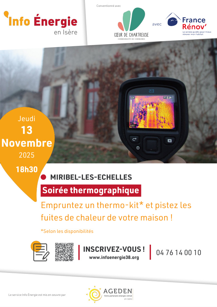 Pour s’inscrire : 04 76 14 10 00 ou sur https://www.infoenergie38.org/soiree-thermographique-a-miribel-les-echelles